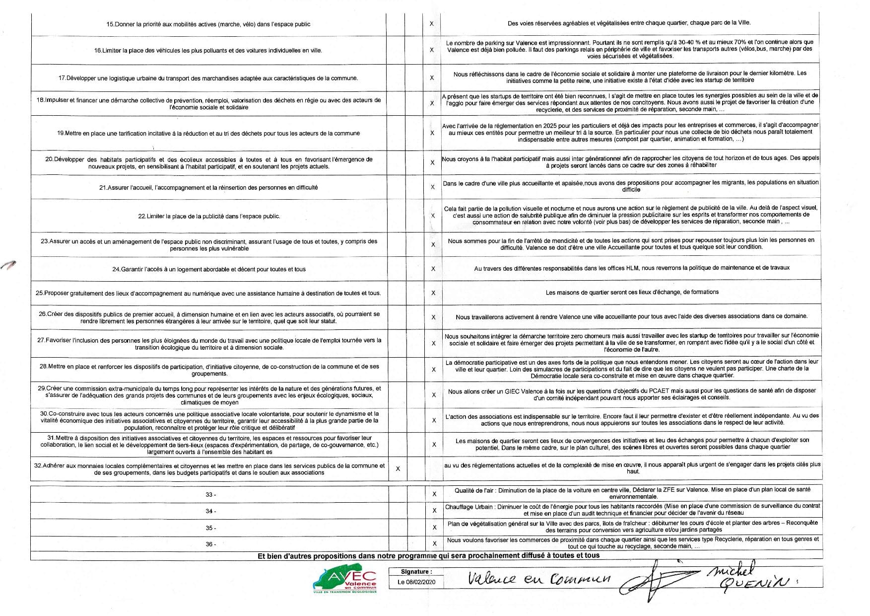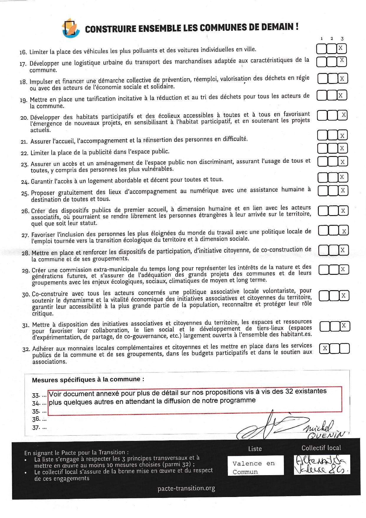 Pour Valence en Commun, représentée par Michel Quenin et Annie Roche, les 32 mesures du Pacte pour la Transition ont été signées : 30 de niveau 3 – 1 de niveau 2 – 1 de niveau 1.